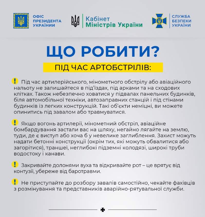 Служба безпеки України оприлюднила короткі інструкції, які можуть врятувати життя. Зокрема, у них є інформація про те, як діяти під час різних видів обстрілу.